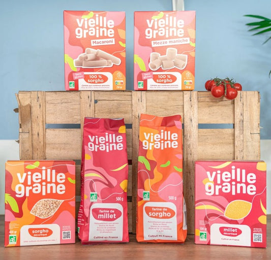 Vieille Graine propose divers produits d'épicerie : les céréales décortiquées, des farines et les premières pâtes 100 % sorgho et sans gluten.